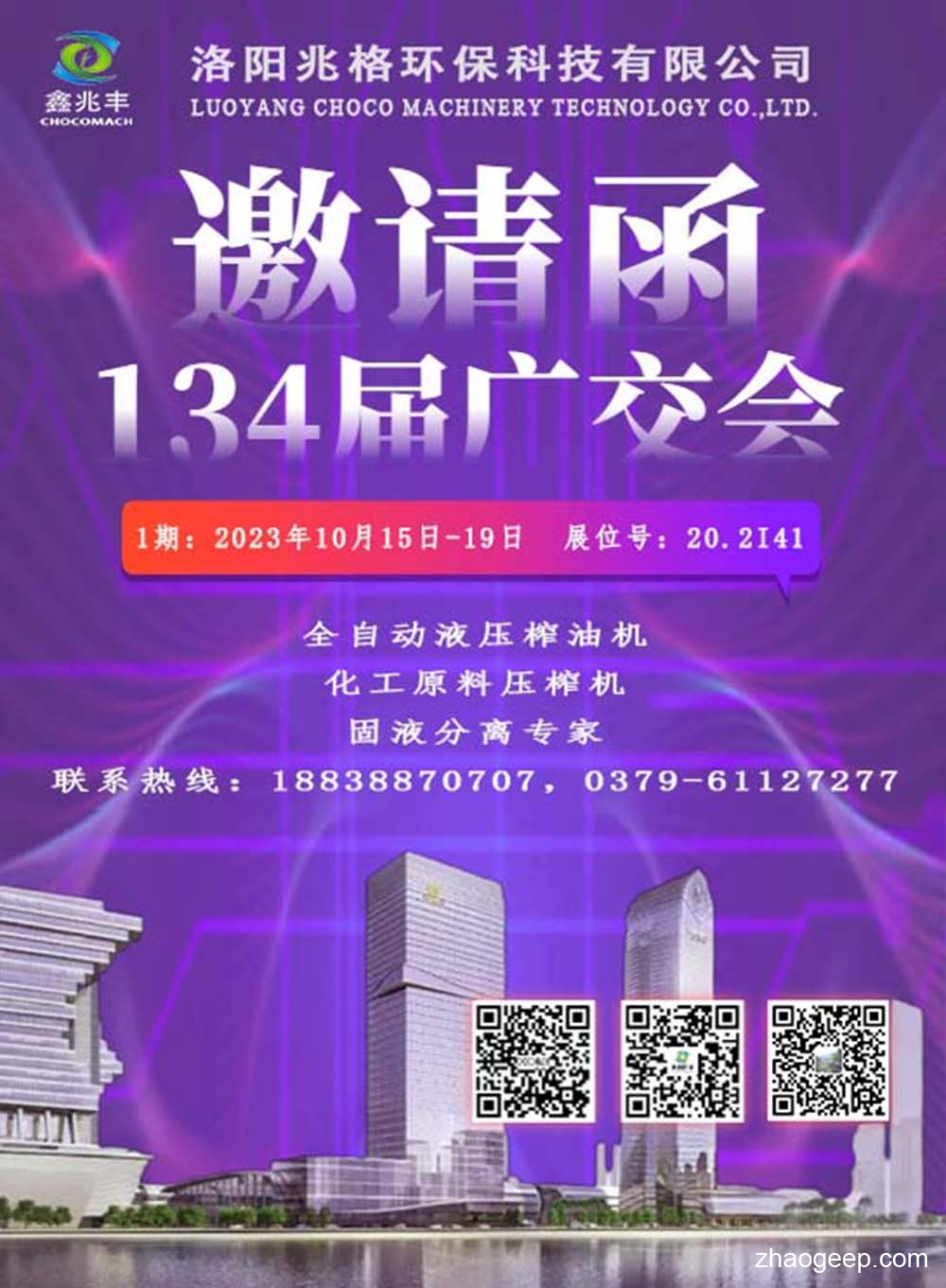第134屆廣交會_10月15-19日_展位20.2I41_兆格環(huán)保鑫兆豐榨油機