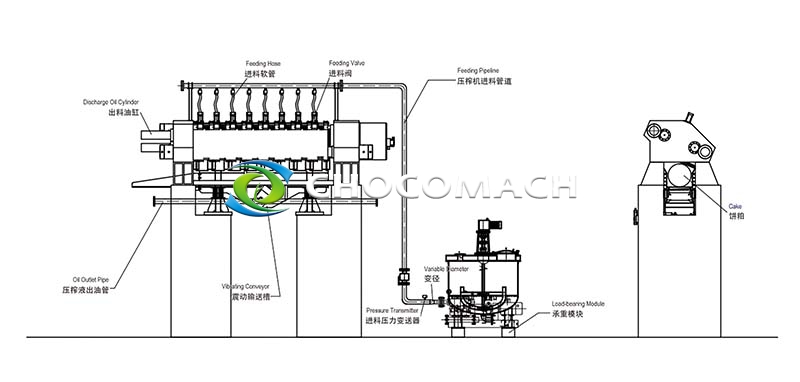 (1)機(jī)械部分采用臥式榨箱/榨腔結(jié)構(gòu),裝料系統(tǒng)和壓榨系統(tǒng)采用單獨(dú)獨(dú)立榨箱/榨腔,出油方式改進(jìn)為“端面出油”,出油路徑更短,出油效率更高。