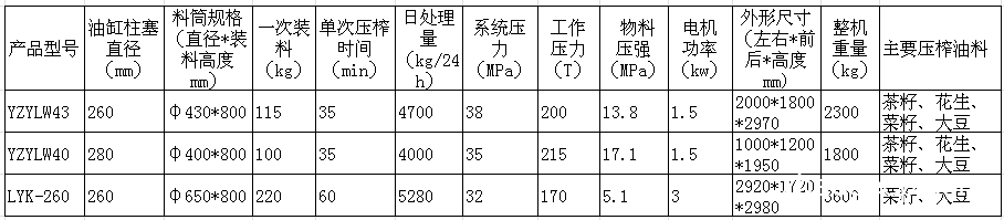 3、YZYL43型液壓榨油機(jī)配備預(yù)壓缸和推拉缸;YZYL40型液壓榨油機(jī)沒有配備預(yù)壓缸和推拉缸,都可以選配;LYK-260榨油機(jī)僅配備預(yù)壓缸,沒有配備推拉缸。