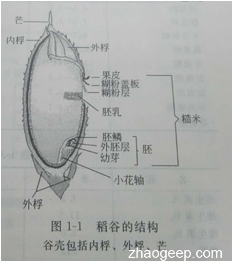 米糠(rice bran)是稻谷(Oryza sativa)脫殼后依附在糙米上的表面層,它是由外果皮、中果皮、交聯(lián)層、種皮及糊粉蓋板層組成的(稻谷加工脫除稻糠(俗稱谷糠、大糠、統(tǒng)糠)之后,在碾制糙米時(shí)將糙米外層的果皮、糊粉蓋板、糊粉層、米胚脫掉集中起來,焦作米糠)。其重量約占稻谷粒重量的5%-5.5%。如果將混在其中的米胚包括進(jìn)去,其重量則占稻谷粒的7.5%-8.0%。稻谷中的稻殼占16%-20%,糙米占80%。糙米中的精白米占72%,米胚占2.5%,米糠占5%-5.5%。稻谷的結(jié)構(gòu)如圖所示: